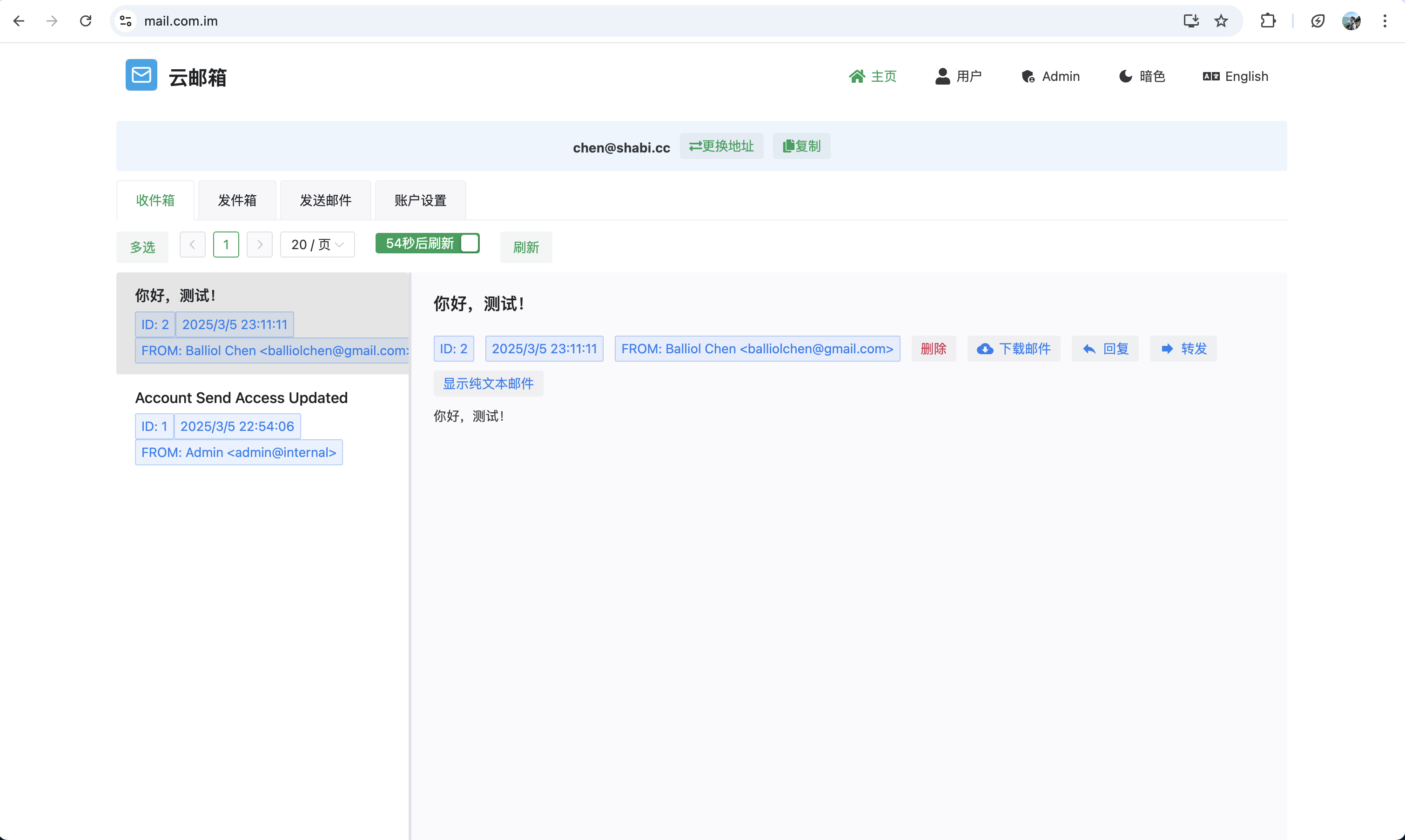 在收件箱查看邮件内容,支持下载附件或转发至其他邮箱。 - 管理邮箱: