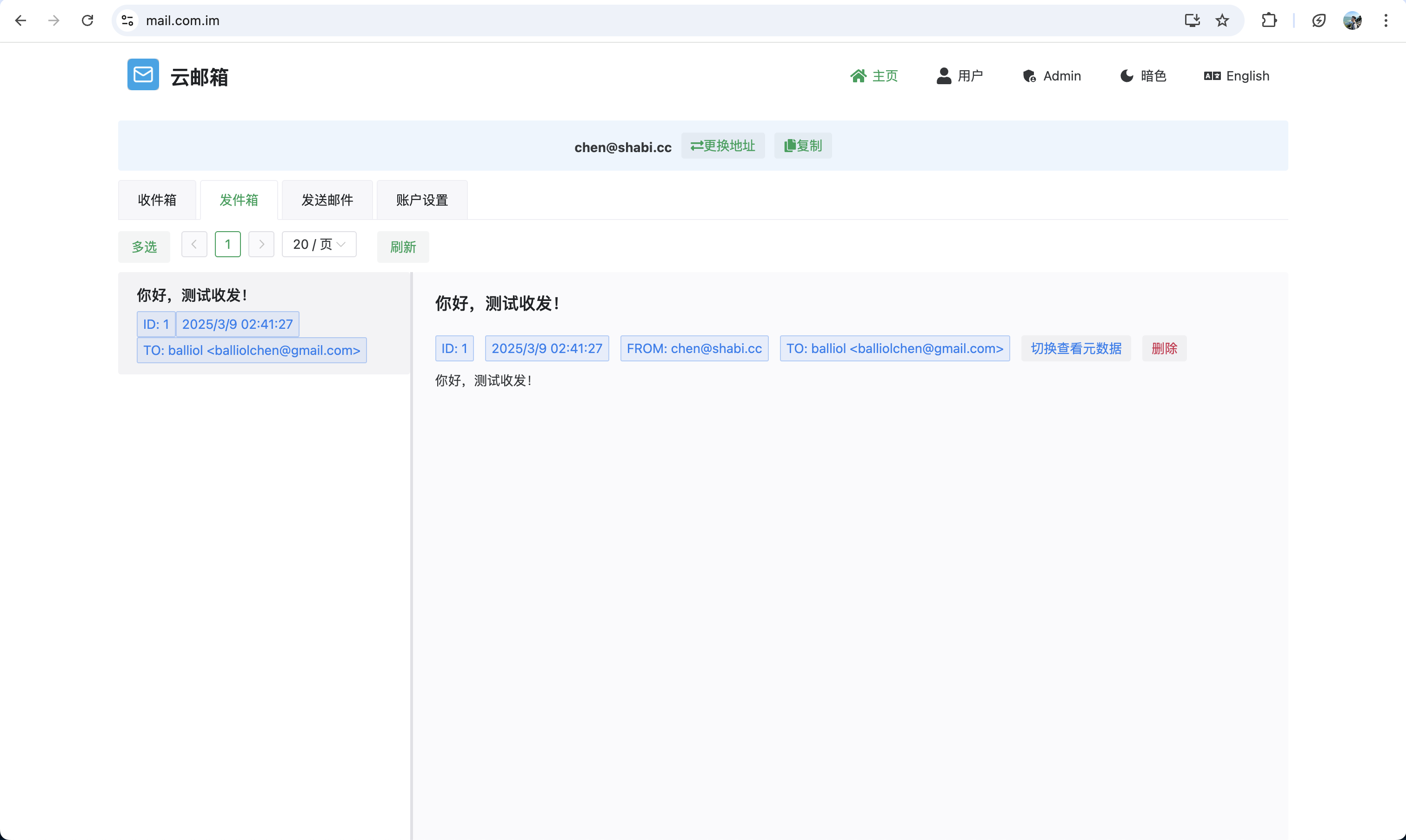 [email protected]),支持复制或通过 QR 码分享。 - 接收邮件与附件:可查看邮件正文、下载附件(包括 EML 源文件),支持 HTML 和纯文本切换。