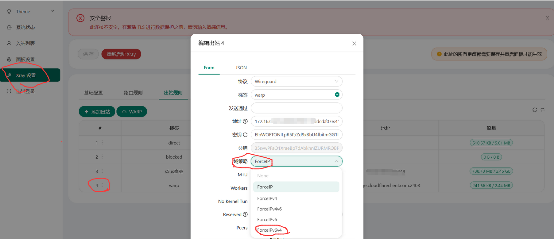 编辑 Warp 出站规则,将域策略改为