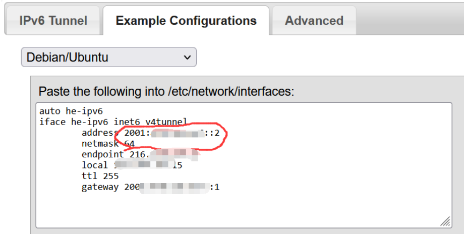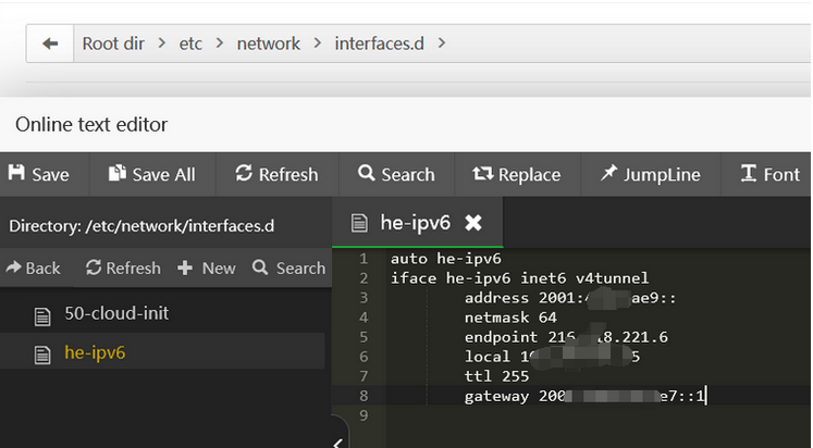/etc/network/interfaces.d/目录下创建he-ipv6文件,内容为复制的配置模板:检查
